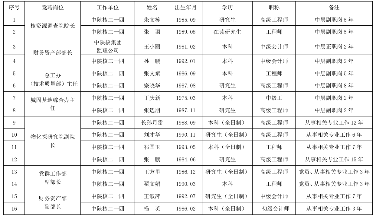 根據(jù)中陜核工業(yè)集團(tuán)二一四大隊(duì)有限公司《中層管理人員選聘工作方案》有關(guān)要求,現(xiàn)對(duì)資格審查通過(guò)的報(bào)名人員予以公示: