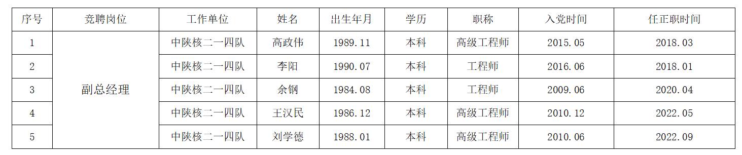 根據《中陜核工業(yè)集團二一四大隊有限公司副總經理崗位市場化選聘工作的實施方案》有關要求,現對資格審查通過的報名人員予以公示: