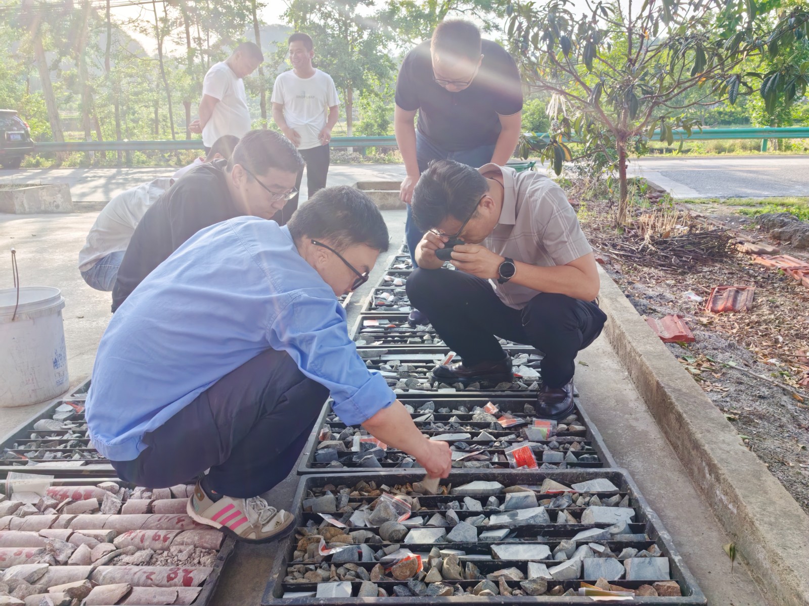 檢查組一行首先聽取了項(xiàng)目負(fù)責(zé)人對(duì)三個(gè)項(xiàng)目進(jìn)展、取得成果及下一步工作安排的詳細(xì)匯報(bào)。隨后,檢查組深入項(xiàng)目工作區(qū),實(shí)地查看礦化蝕變帶及鉆孔巖芯。在現(xiàn)場(chǎng),檢查組成員與項(xiàng)目團(tuán)隊(duì)圍繞工作區(qū)地質(zhì)特征、成礦條件展開交流探討,對(duì)下一步找礦思路及方法提出了指導(dǎo)性建議。