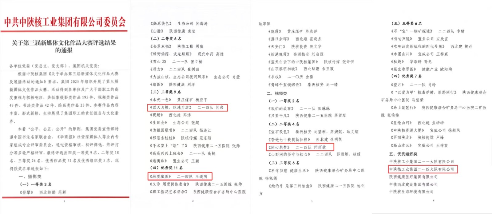 近日,中陜核二一四隊在集團第三屆新媒體文化作品大賽與“奮進七十載建功新時代”主題征文比賽中斬獲頗豐,共榮獲一等獎1項、二等獎1項、三等獎2項、優秀獎1項,同時憑借組織工作成效顯著,斬獲兩項“優秀組織獎”。