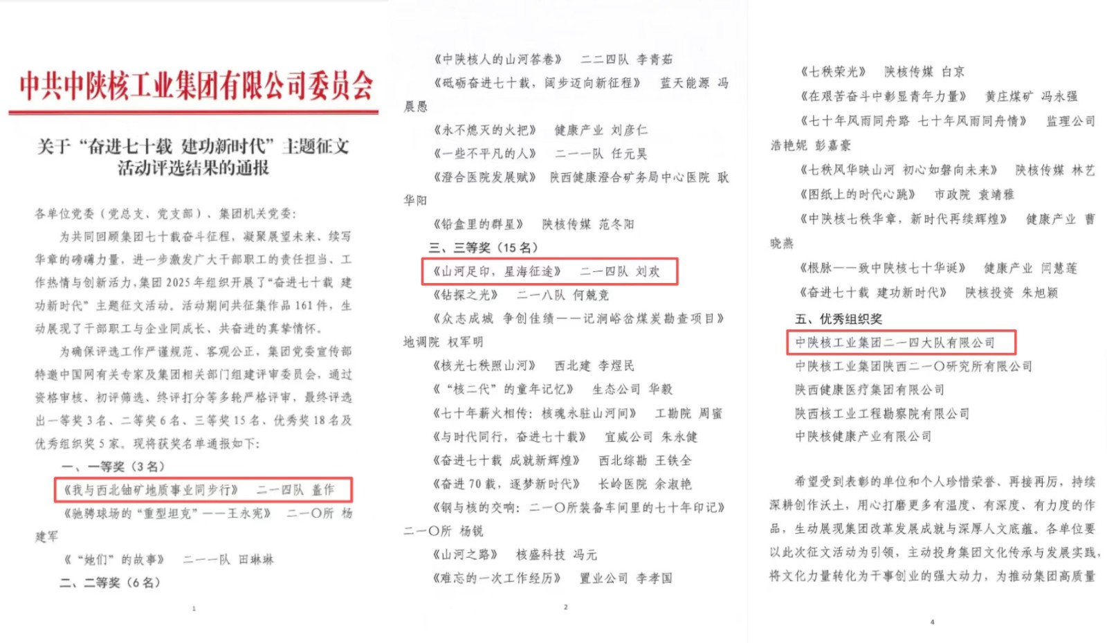 在“奮進七十載建功新時代”主題征文比賽中,二一四隊選送的征文《我與西北鈾礦地質事業同步行》(作者:蓋作)以真摯的情感、生動的細節和深刻的主題,榮獲征文類一等獎;《山河足印,星海征途》(作者:劉歡)則憑借其對地質事業的深刻理解和詩意表達,獲得征文類三等獎。這兩篇征文不僅展示了二一四隊在西北鈾礦地質事業中的歷史貢獻和現實成就,也體現了地質工作者對事業的忠誠與熱愛。