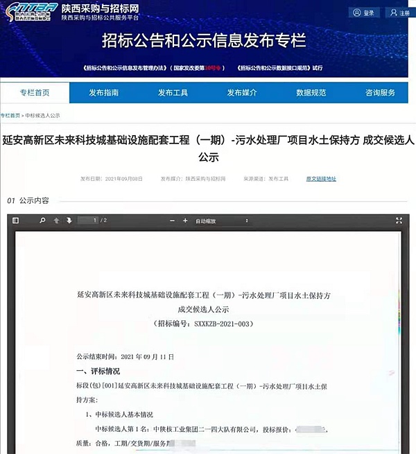 9月8日,通過陜西采購與招標(biāo)網(wǎng)公示信息獲悉,公司參與競爭性磋商的“延安高新區(qū)未來科技城基礎(chǔ)設(shè)施配套工程(一期)-污水處理廠項目水土保持方案”,經(jīng)評標(biāo)小組專家審定,被確定為第一中標(biāo)候選人。