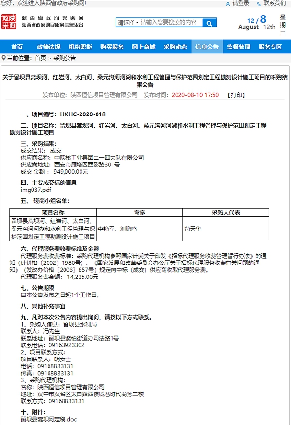 8月10日,從陜西省政府采購網獲悉,公司成功中標“留壩縣蒿壩河、紅巖河、太白河、桑元溝河河湖和水利工程管理與保護范圍劃定工程勘測設計施工項目”。