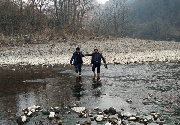 公司王義忠一行到達項目部駐地后,首先聽取了水工環院副院長余鋼對項目工作情況介紹,該項為水工環調查院承擔了胡家壩鎮政府委的地熱調查市場項目,2017年12月份主要開展了野外地質路線調查、泉水調查工作。隨后,深入現場對楊家河壩熱水潭異常點及周圍巖性構造,高家山地形、水文、地貌特征進行實地查看。在去黃家灣地熱異常點實地查看過程中,發現河對面有明顯的地熱水異常現象,由于高速公路阻隔,沒有便捷到達河對面的便道,為了不放過任何一個異常點,王義忠不顧冬季冰冷的河水,依然帶領大家脫下鞋襪涉水過河,到達河對面的地熱水異常點,測量水溫,查看并測量構造走向展布方向。