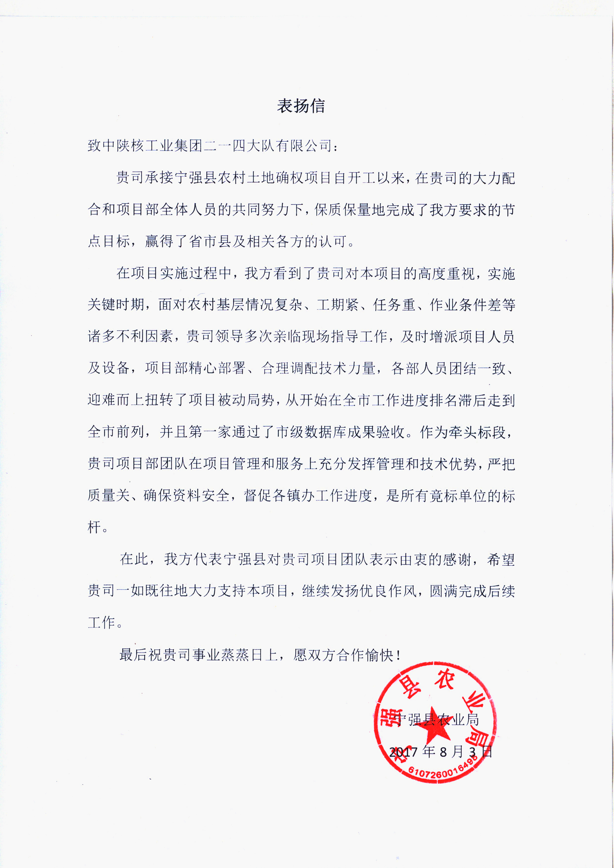 8月3日,公司收到寧強(qiáng)縣農(nóng)業(yè)局的表?yè)P(yáng)信,稱贊公司領(lǐng)導(dǎo)多次親臨現(xiàn)場(chǎng)指導(dǎo),精心部署,增派技術(shù)人員。項(xiàng)目部人員團(tuán)結(jié)一致、迎難而上扭轉(zhuǎn)了項(xiàng)目被動(dòng)局面,使寧強(qiáng)縣土地確權(quán)工作進(jìn)度從漢中市排名滯后走到全市前列,成為第一家通過(guò)了市級(jí)數(shù)據(jù)成果驗(yàn)收,是所有競(jìng)標(biāo)單位的標(biāo)桿。