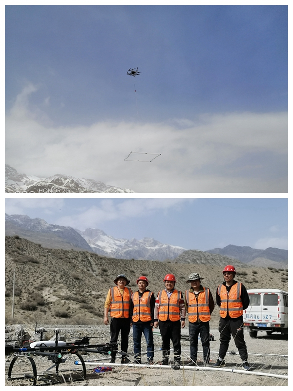 針對該項目工區地形切割劇烈、山勢陡峭,常規地面瞬變電磁勘查工作難以開展,受高海拔山地小氣候影響伴隨刮風、降雪、低溫環境給飛行安全造成很大風險。為確保核心技術攻關成果的落地和經濟效益轉化顯著,項目組采用非常規氣動布局大載重旋翼無人機柔性緩沖承重結構作為飛行平臺,搭載航空電磁儀和自主研發的重載荷大接收面積接收線圈實現外業數據采集,技術團隊齊心協力完成了空域飛行備案,按設計時間節點保質保量完成了外業數據采集。在項目的實施過程中,一線黨員主動發揮先鋒模范作用,極大激勵一線技術人員追趕新技術、學習新知識、靈活新思路、向業界難題發起攻關。