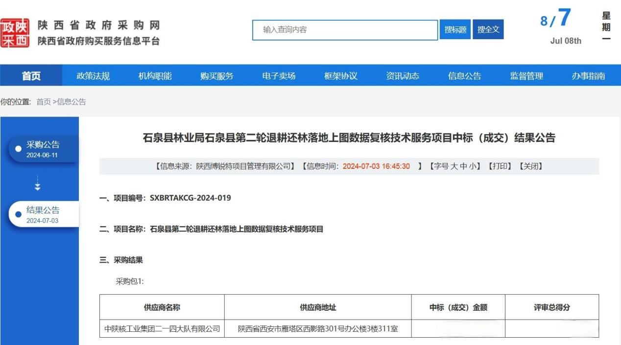 近日,據陜西省政府采購網公告獲悉,公司水工環(huán)院成功中標“石泉縣第二輪退耕還林落地上圖數據復核技術服務項目”。